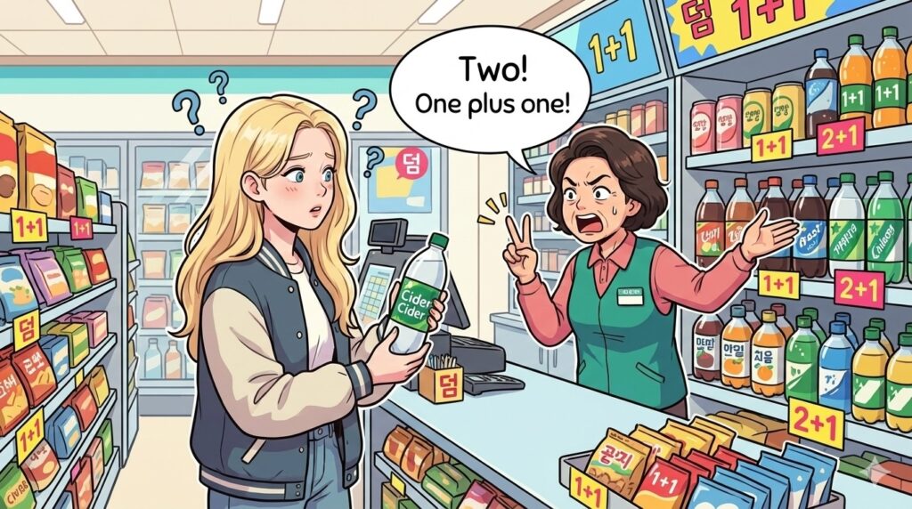 I later realized I had walked away from free money. In Korea, 1+1 means “Buy one, get one FREE.” Ignoring it is basically a crime.