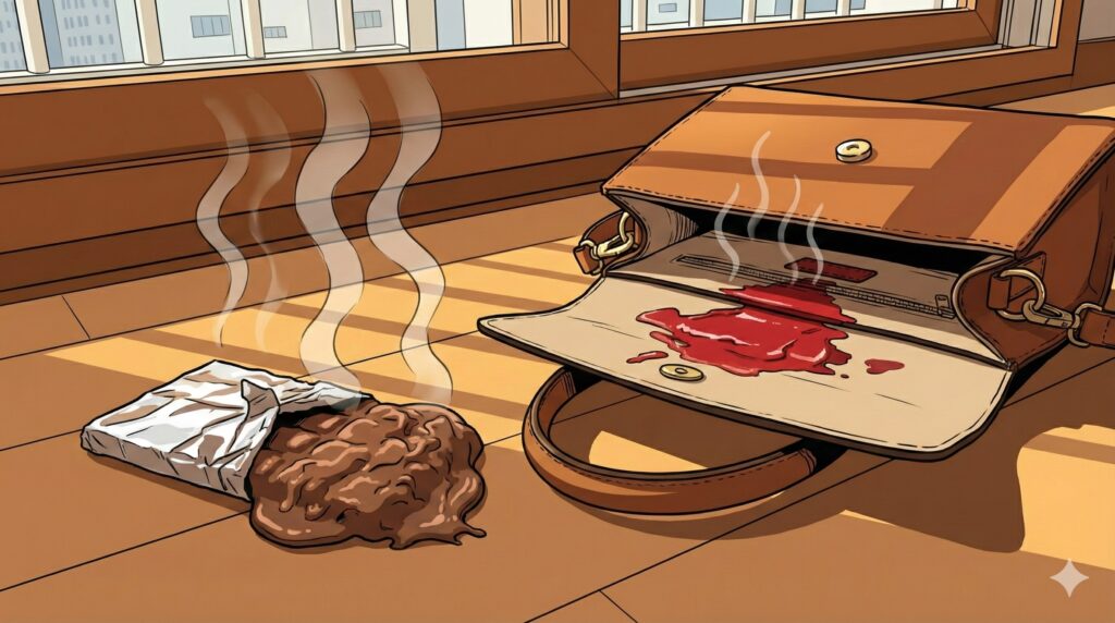 An hour later, I opened my bag. My new chocolate bar felt like a squishy sponge. Worse, my favorite MAC lipstick had turned into red soup. It leaked all over my bag.