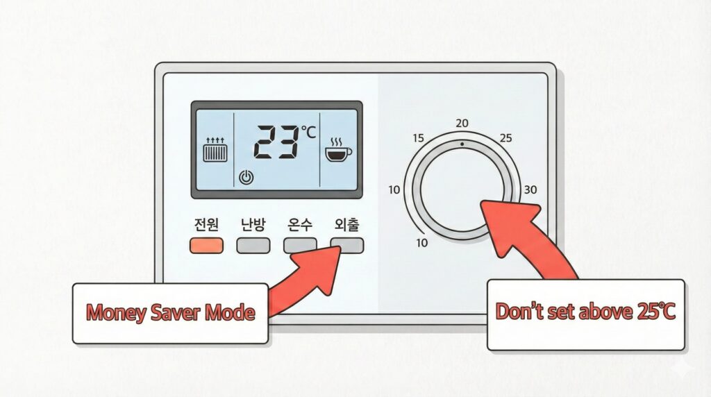 Look at your boiler control panel on the wall. Find the button that says 외출 (Oe-chul).